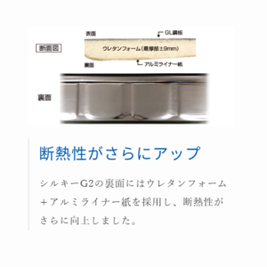 またシルキーG2は裏面にアルミライナー紙とその内側にウレタンフォームが施されているので、断熱性の向上を期待できます。実際に施工されたお客様より、夏が少し過ごしやすくなったとの評価もいただきました。とくに2階のお部屋には差が出ると思います。