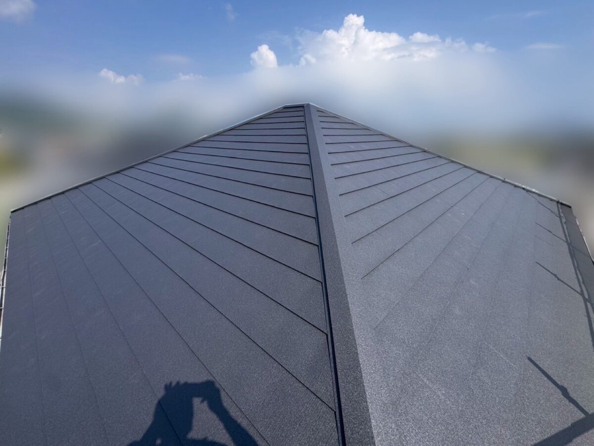 今回は 福泉工業のシルキーG2 を使用しました。こちらは、遮熱ちぢみ塗装 ウレタン一体型ガルバリウム鋼板屋根材で、断熱材一体型です。断熱性・防露性・軽量性・耐候性に優れ、見た目もシャープで雰囲気もよく、弊社の工事ではよくお客様に選ばれています。